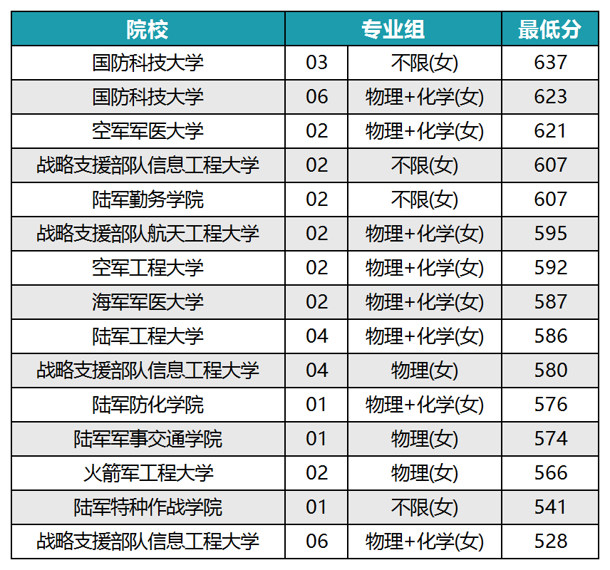 分数线较低的几所军校是火箭军工程大学第02专业组566分、陆军特种作战学院第01专业组541分、战略支援部队信息工程大学第06专业组528分。