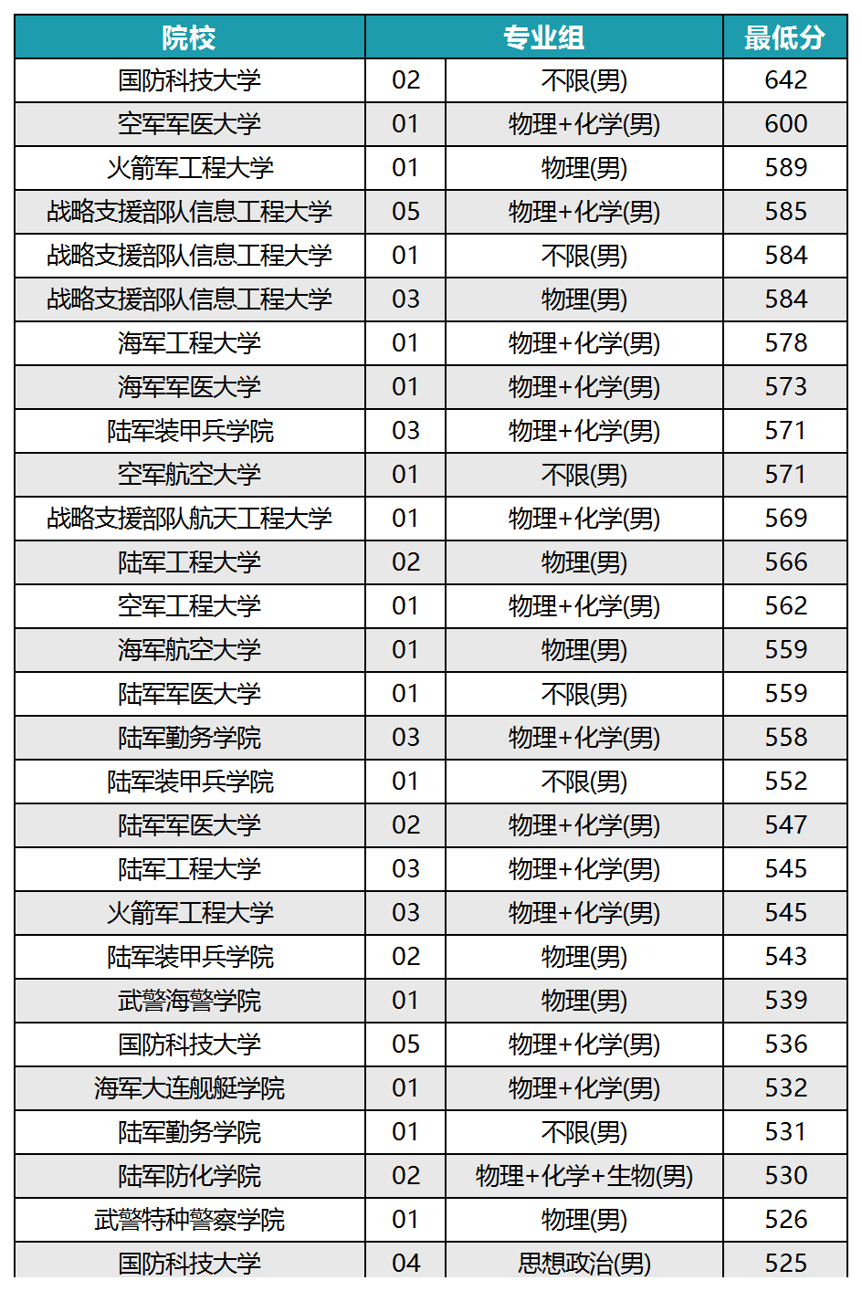 其中录取分在600分以上的军校有国防科技大学第02专业组642分、空军军医大学第01专业组600分。