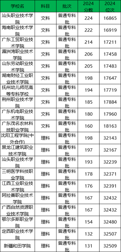 文科录取分数线最低,最好考的公办专科大学:广东茂名农林科技职业学院,2024年最低分160分,最低位次18163名;其次是广东机电职业技术学院,最低分都在180分,最低位次都在17960名。