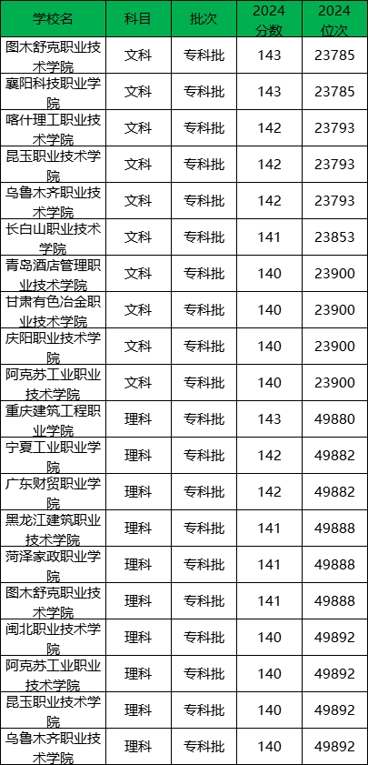 文科录取分数线最低,最好考的公办专科大学:阿克苏工业职业技术学院、庆阳职业技术学院、甘肃有色冶金职业技术学院,2024年最低分为140分,最低位次在23900名。