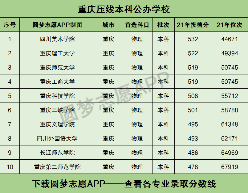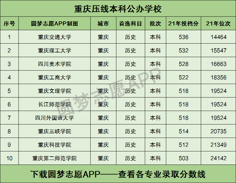 根据重庆市教育考试院公布的招录数据,圆梦志愿为大家整理了2021年高考在重庆市投档分数线最低的10所公立大学的名单及其具体投档分、投档位次,供重庆市2022年的高三同学查阅。