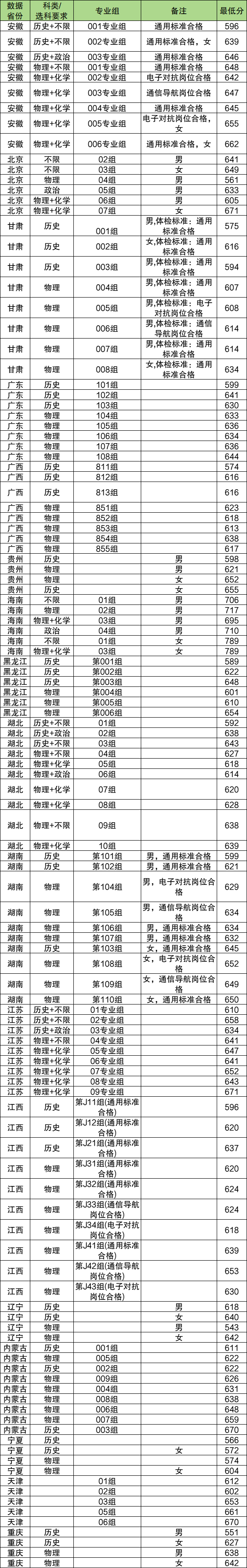 物理类:618分到653分,最低分专业组为第J34组(电子对抗岗位合格)、最高分专业组为第J42组(通信导航岗位合格)。