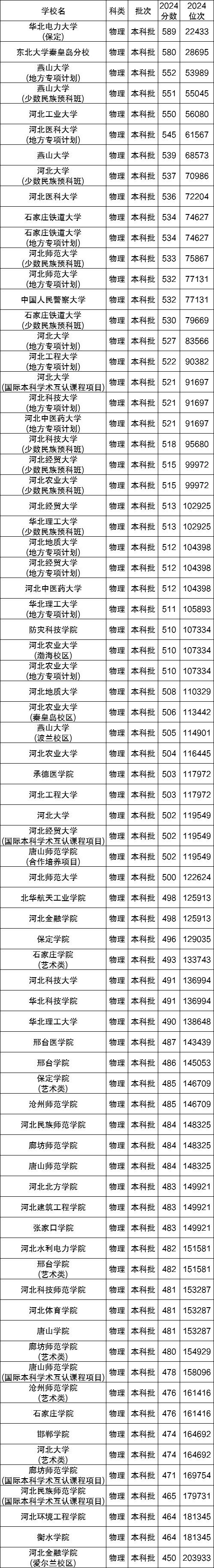 下面是2024年各河北的公办本科大学在河北省物理类的录取分数线