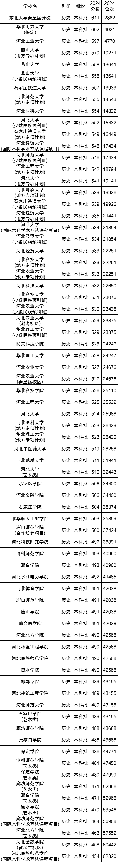下面是2024年各河北的公办本科大学在河北省历史类的录取分数线(供参考):