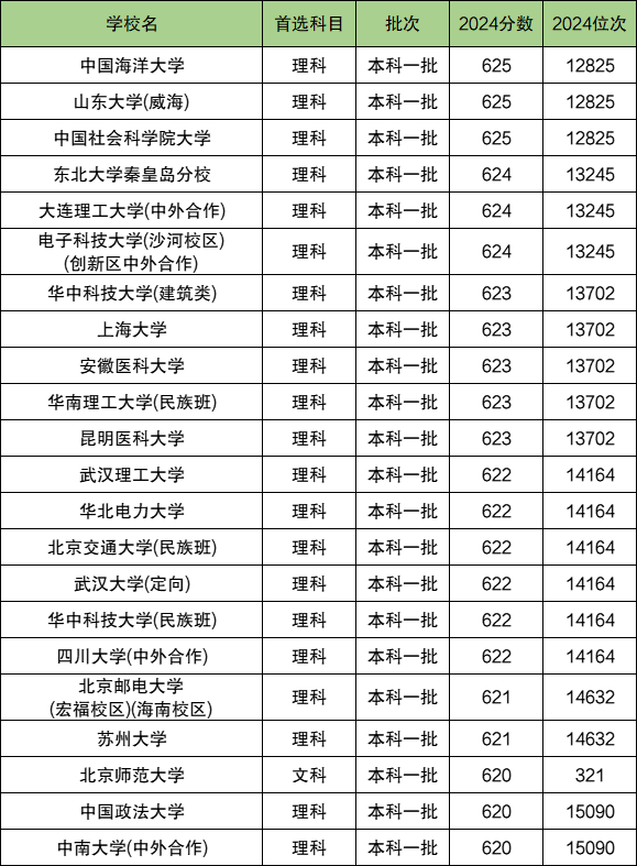 理科分数线刚好为620分的大学:中国政法大学、中南大学(中外合作)。