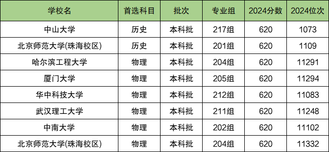 历史组分数线在620分的大学及专业组:中山大学217组、北京师范大学(珠海校区)201组;
