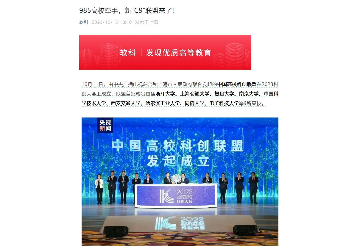 而在2023年10月,由中央广播电视总台和上海市人民政府联合发起的中国高校科创联盟在2023科创大会上成立,联盟首批成员包括浙江大学、上海交通大学、复旦大学、南京大学、中国科学技术大学、西安交通大学、哈尔滨工业大学、同济大学、电子科技大学等9所高校。