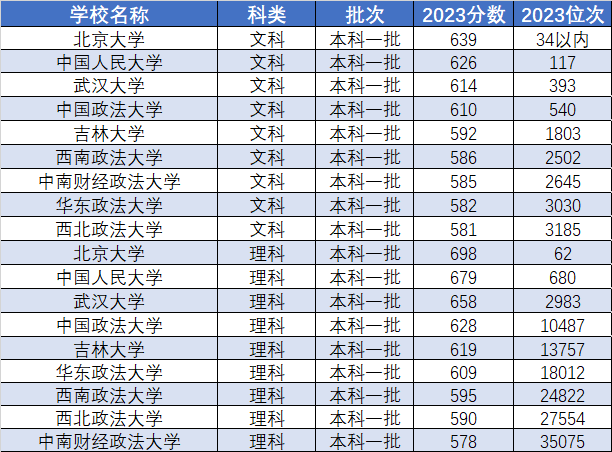 由于四川没有公布这些院校具体的法学类专业分数线,老师就以院校本身的录取分数线出发,为大家整理五院四系相关的分数内容。从下表整理的录取数据来看,五院四系中文理科录取分数最高的都是北京大学,录取分数文科为639分,理科为698分。在四川文科录取分数最低的是西北政法大学,录取分数为581分;理科录取分数最低的是中南财经政法大学,录取分数为578分。