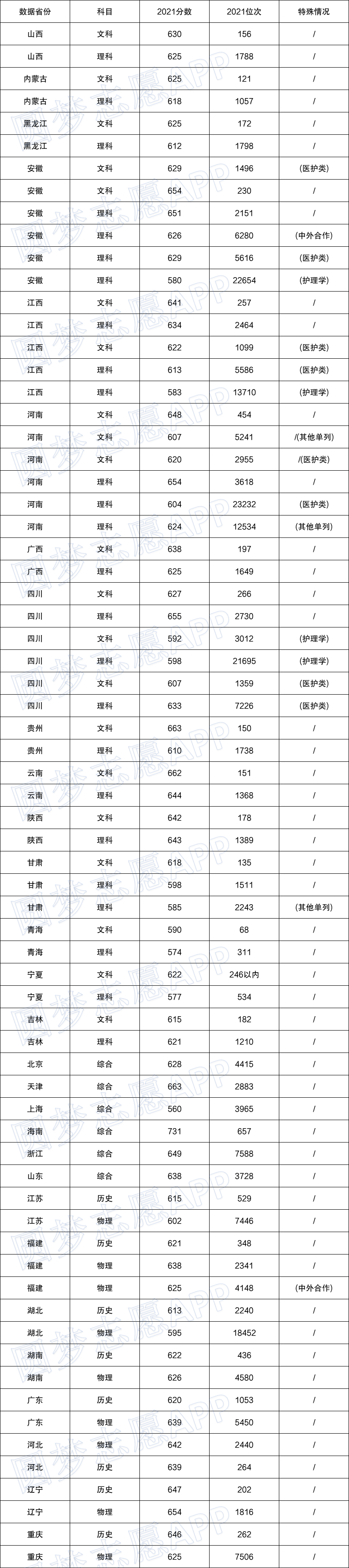 如上图所示,就是武汉大学2021年在各省市区的最低录取分数线和位次情况,其中在特殊情况一栏打“/”的,则表示是普通一批次最低录取分,而如有标记(医护类)、(中外合作)的,则是武汉大学把一些专业单独列出来招生的分数线。