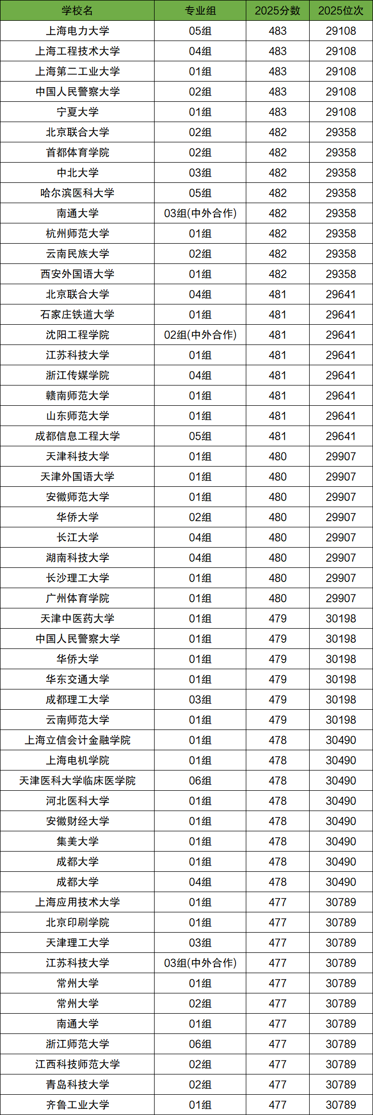 位次在30000左右的基本属于省重点或实力较强的双非院校,分数在477-483分之间。其中位次相对靠后的有南通大学01组、浙江师范大学06组、江西科技师范大学02组、青岛科技大学02组、齐鲁工业大学01组。