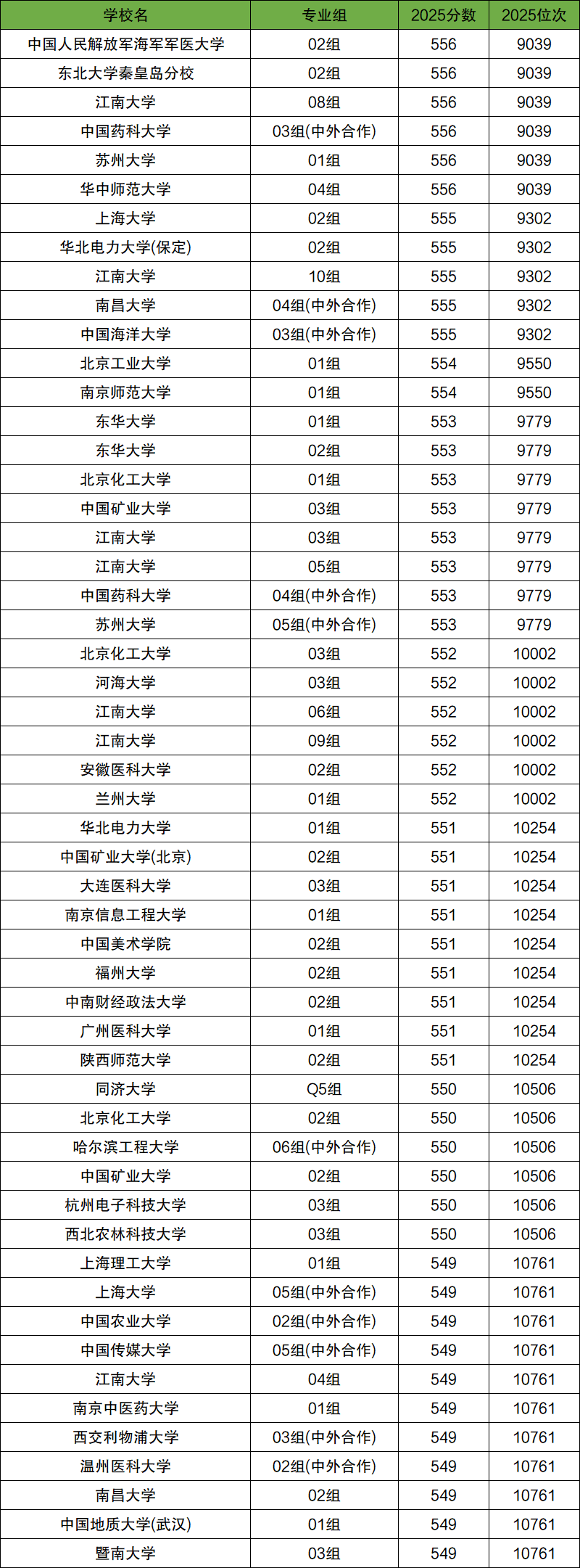 位次在10000左右的基本属于985或实力较强的211院校,分数在556-549分之间。其中位次相对靠后的有西交利物浦大学03组(中外合作)、温州医科大学02组(中外合作)、南昌大学02组、中国地质大学(武汉)01组、暨南大学03组等。