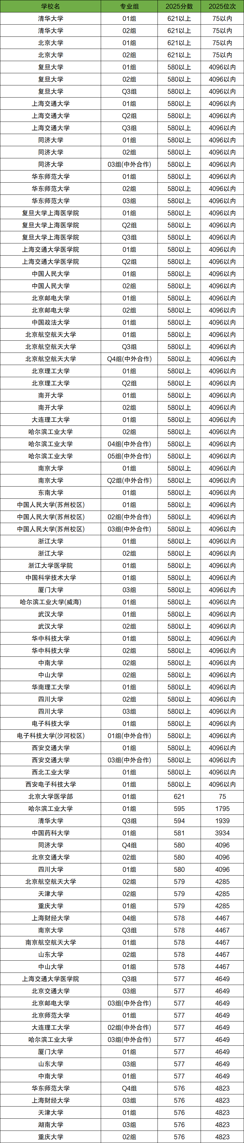2025年各大学在上海本科的录取线在387-621分以上之间,录取位次在75以内-52048名之间。其中排名位次在75以内的专业组有4个,依次是清华大学01组、清华大学02组、北京大学01组、北京大学02组。