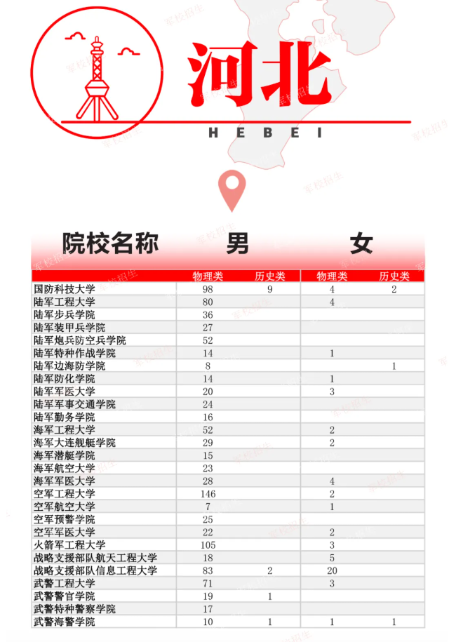 2024年在河北招生的军校有27所,包含国防科技大学、陆军炮兵防空兵学院、陆军边海防学院、陆军军事交通学院、海军工程大学、海军航空大学、海军军医大学、空军预警学院、火箭军工程大学、武警工程大学。关于完整版的院校名单以及各军校在河北的招生人数,详情如下: