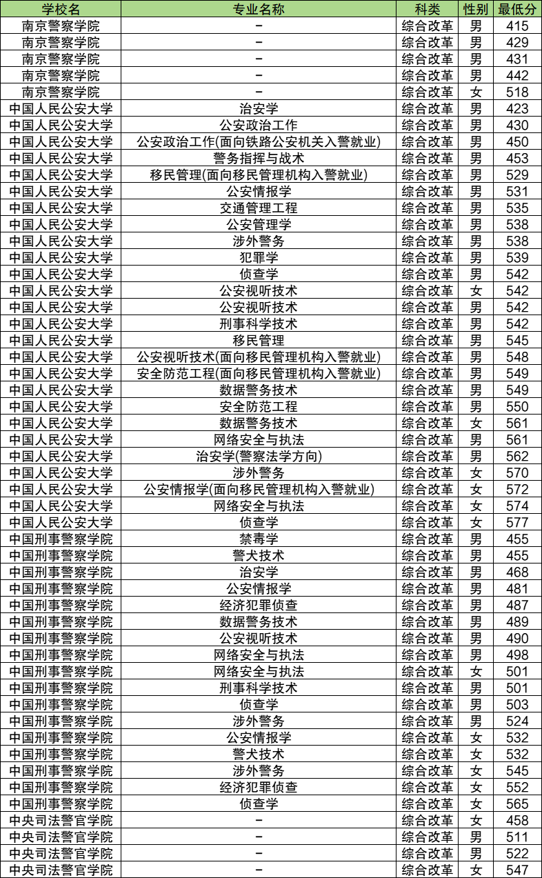 2024年在上海综合改革招生的警校录取分数线范围是415分到577分,收分最低的学校为南京警察学院,2024年男生最低分415分;收分最高的学校为中国人民公安大学,2024年女生最低分577分,对应专业为侦查学。