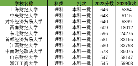 2023年排名前十的财经大学在四川理科也都是在本科一批录取,录取分数区间在545分-646分。录取分数超过600分的财经大学要多余文科,如上海财经大学(646分)、中央财经大学(643分)、对外经济贸易大学(640分)、西南财经大学(609分);理科录取分数最低的是浙江工商大学545分。