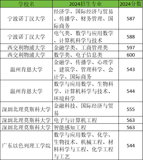 中外合作招生院校一共有8所,分别是西交利物浦大学、宁波诺丁汉大学、上海纽约大学、深圳北理莫斯科大学、昆山杜克大学、广东以色列理工学院、温州肯恩大学、海南比勒费尔德应用科学大学。中外合作录取分数线一般在500分左右,各省不一样,如2024年广东省历史类最低532分、物理类543分。