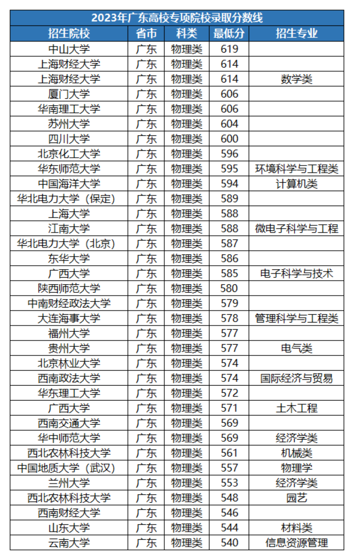 2023年面向广东物理类高校专项招生的院校中,报考门槛最高的是中山大学,投档分数高达619分。此外上海财经大学(614分)、厦门大学(606分)、华南理工大学(606分)等院校的分数线均超过了600分,报考门槛相对较高。