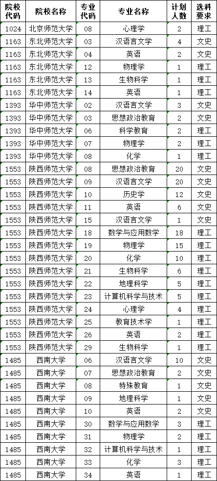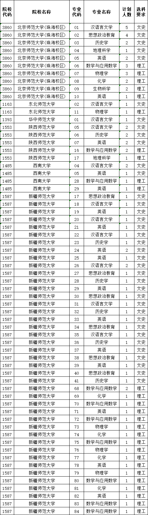 院校名单:北京师范大学(珠海校区)、东北师范大学、华中师范大学、陕西师范大学、西南大学、新疆师范大学