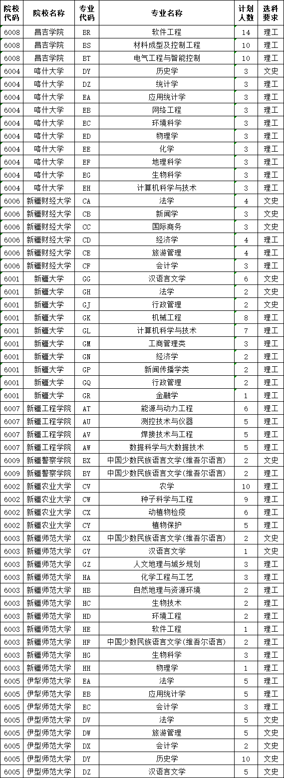 院校名单:昌吉学院、喀什大学、新疆财经大学、新疆大学、新疆工程学院、新疆警察学院、新疆农业大学、新疆师范大学、伊犁师范大学。