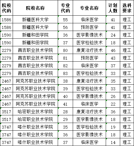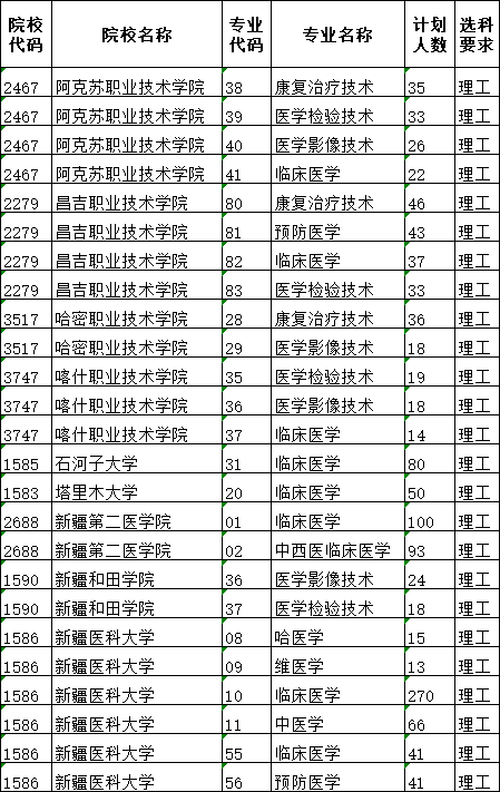 院校名单:新疆医科大学、新疆和田学院、昌吉职业技术学院、阿克苏职业技术学院、哈密职业技术学院、喀什职业技术学院等。