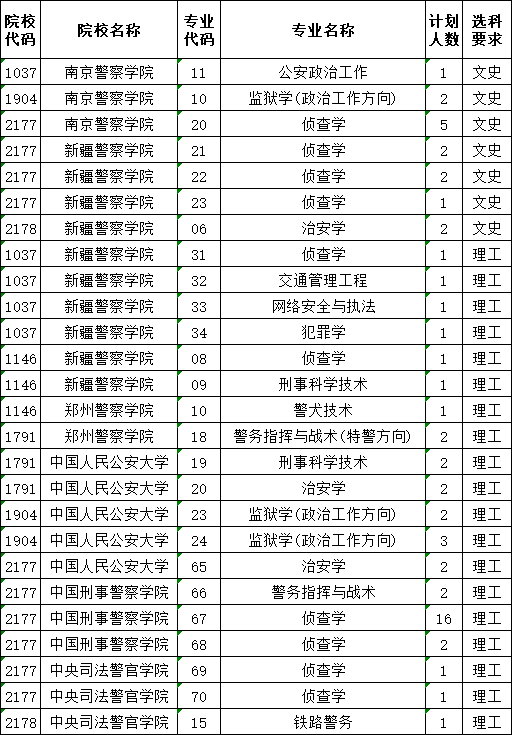 院校名单:南京警察学院、新疆警察学院、郑州警察学院、中国人民公安大学、中国刑事警察学院、中央司法警官学院。