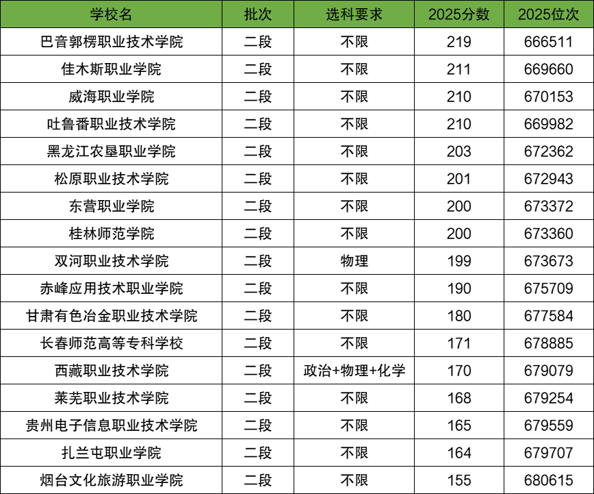 如果高考成绩只有200多分,可以考虑报考一些专业技能性强的大学。查阅圆梦志愿数据库后可以发现,全国有一些高职高专院校是适合200分左右的考生报考的: