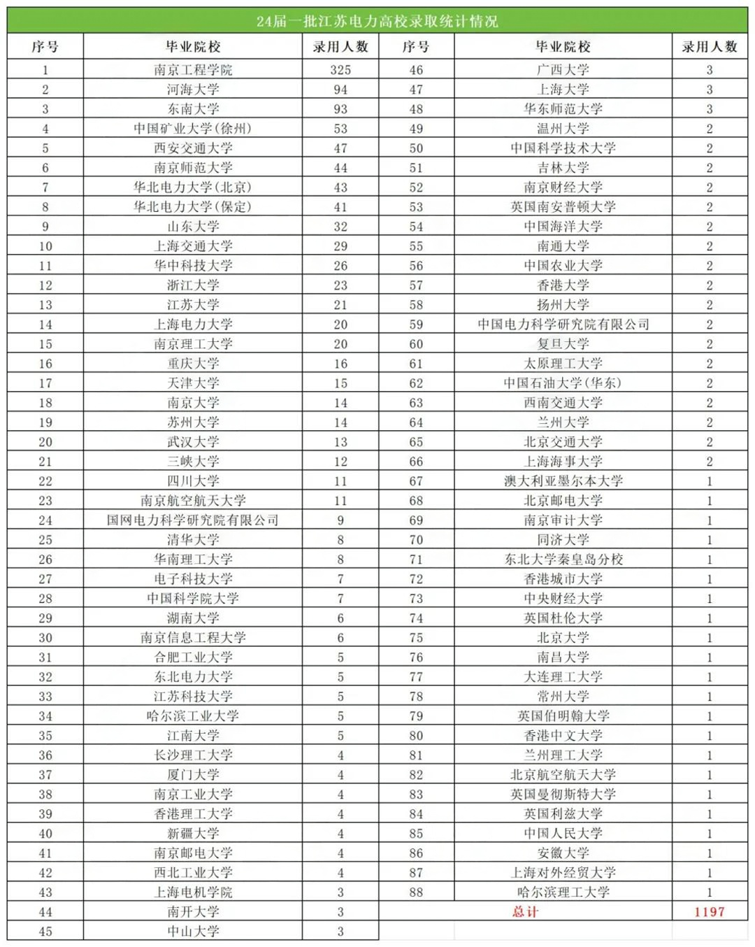 我们根据2024届国网江苏电力高校录用统计表可以看到,本年度国网江苏电力分公司共计录用1197名应届生,而南京工程学院就有325名毕业生在国网一批中被电力公司录用,约占电力系统录用人数的1/3,远超省内其他211高校——河海大学(94人)、东南大学(93人)。