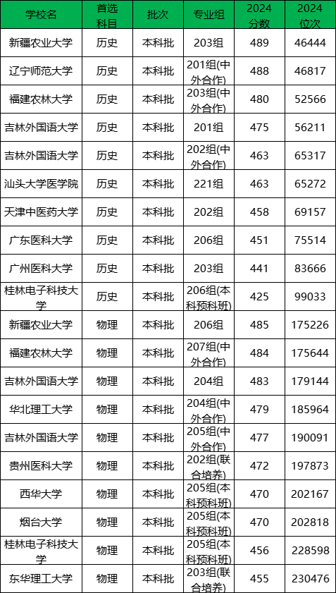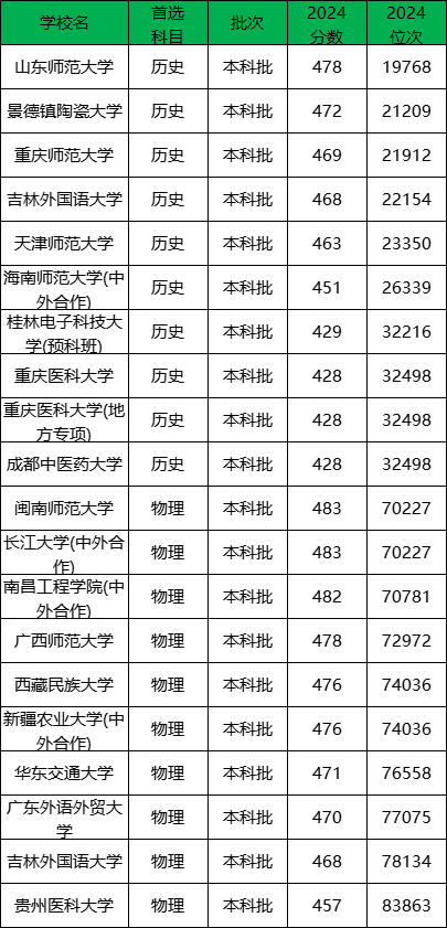物理录取分数线最低,最好考的重点大学:贵州医科大学,2024年最低分475分,最低位次83863名;其次是吉林外国语大学,2024年最低分468分,最低位次78134名。