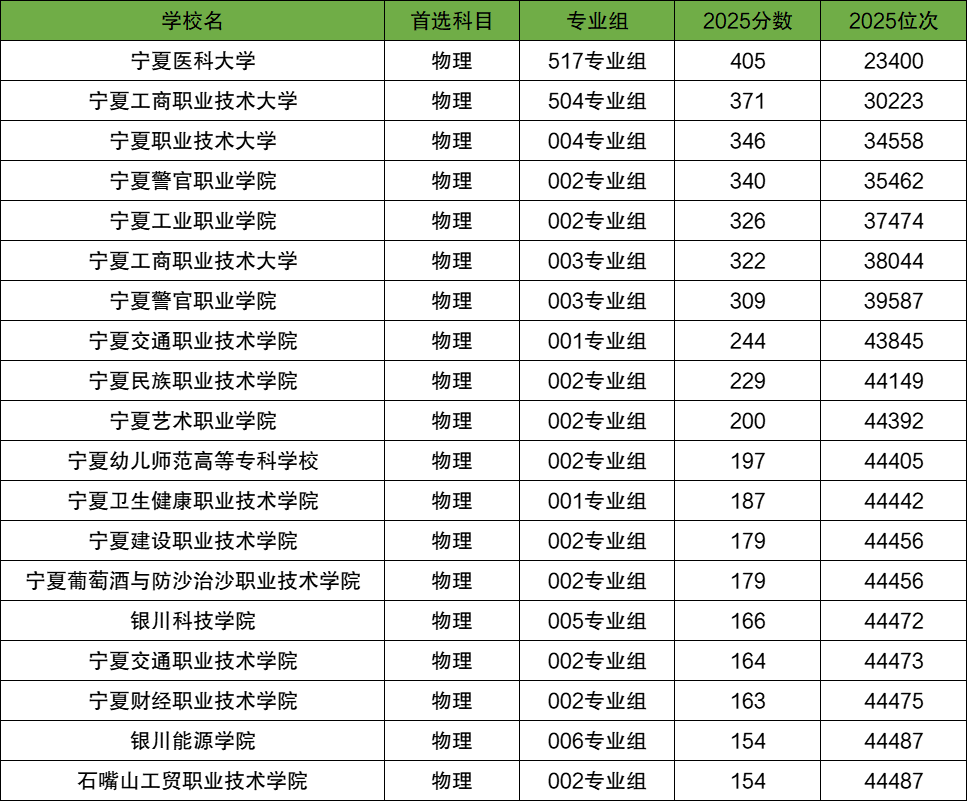 最难考的是宁夏医科大学517专业组,2025年录取最低分405分,对应省位次是23400名;最好考的是石嘴山工贸职业技术学院002专业组、银川能源学院006专业组,2025年最低分154分,对应省位次是44487名。