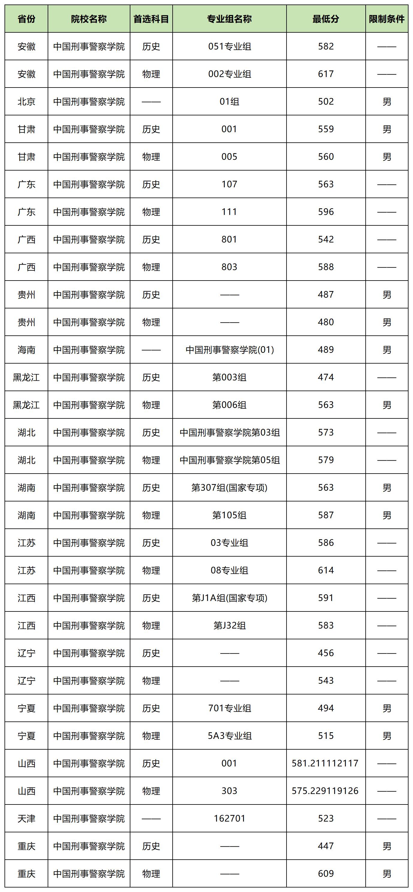 2025年中国刑事警察学院在安徽招生最低分为582分(历史类);