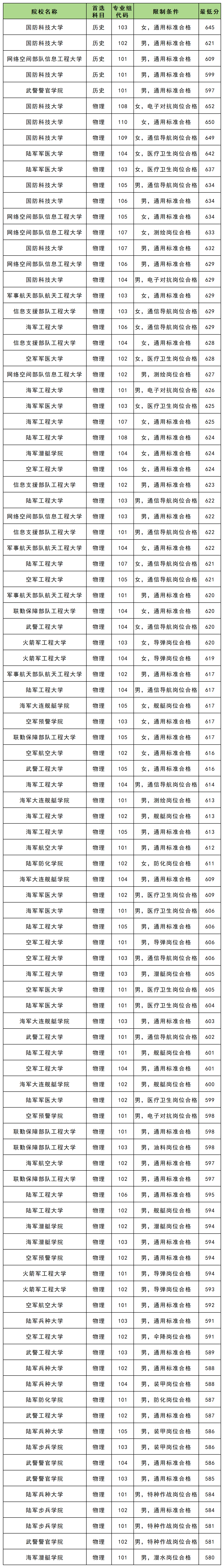 女生最低分的是国防科技大学103组(通用标准合格),2025年分数线为645分;