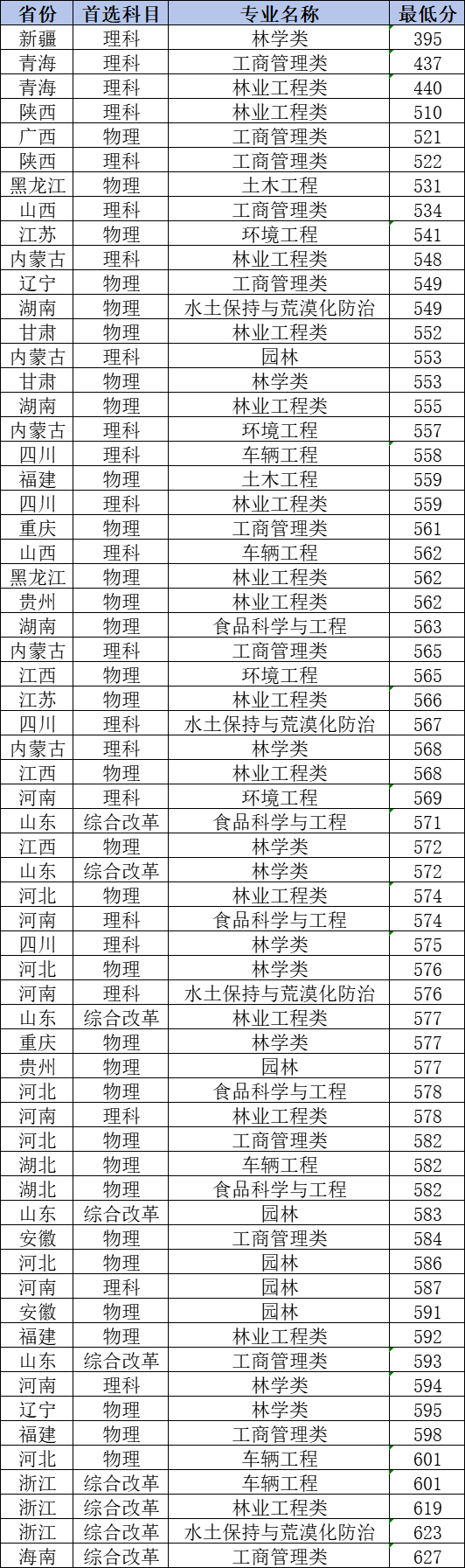 2024年北京林业大学高校专项计划各省录取最低分一览表: