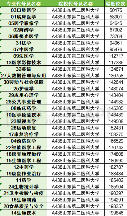 以山东第二医科大学在河北物理的录取情况为例,其中临床医学的最低分为588,麻醉学的最低分为581,预防医学的最低分为531,药学的最低分为543。关于学校在更多省市的录取分数线,本文都进行了整理,供查阅。