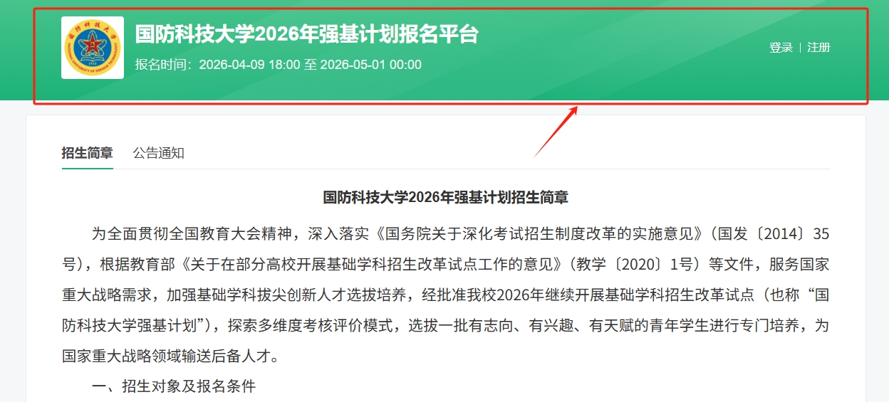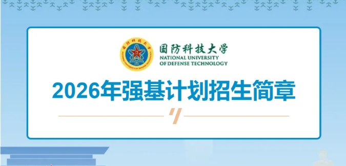 2026年国防科技大学强基计划招生简章已于4月9日公布,报名时间为4月9日至4月30日。该校强基招收无军籍地方应届普通高中毕业生,要求政治面貌为中共党员或共青团员,招生专业包括数学与应用数学、物理学、飞行器动力工程。