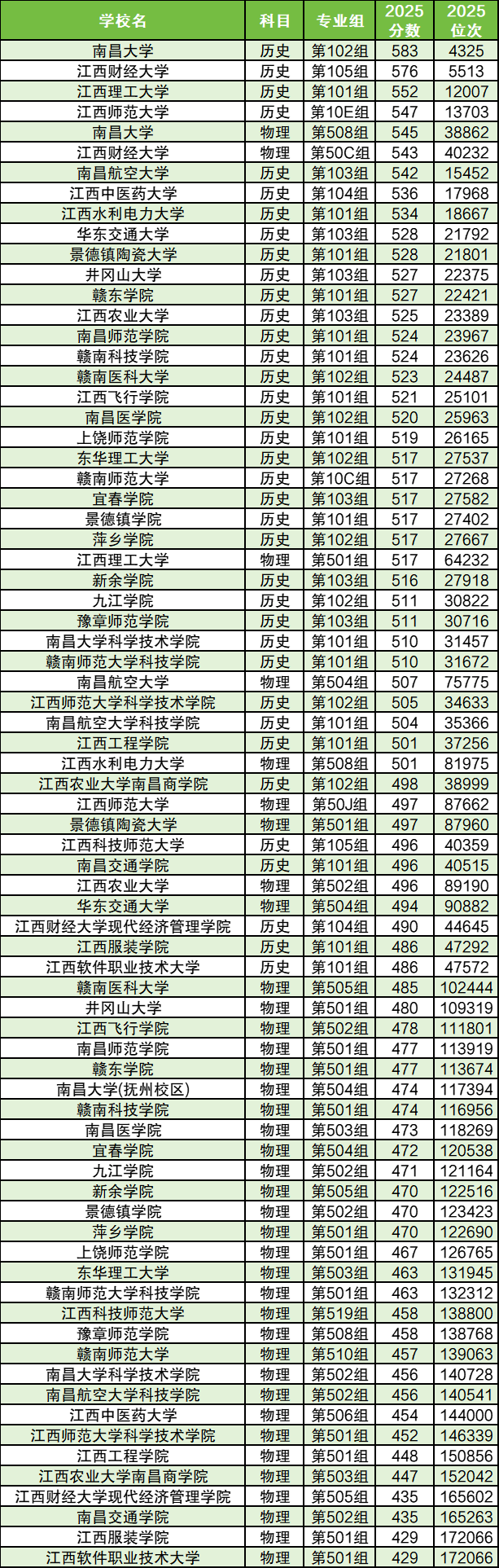 2025江西各大学录取分数线及位次排名分别是:江西师范大学547分(历史类13703位)、497分(物理类87662位),江西财经大学576分(历史类5513位)、543分(物理类40232位)等,更多分数线和位次请见下文。