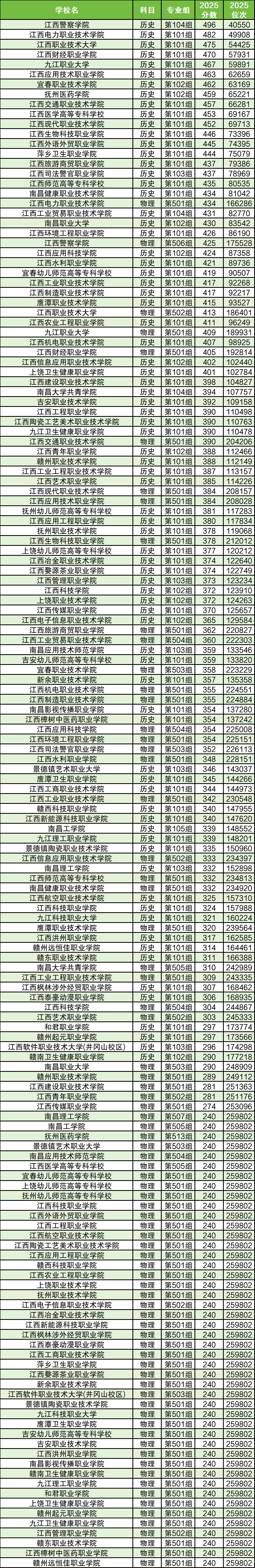 参考2025年江西录取数据,江西历史类专科各大学录取分数线最高的是:江西警察学院,2025年最低分数线是496分,位次排名是40550位。