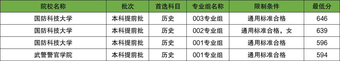 其中最低分院校为武警警官学院(001专业组),2025年最低分为594分。最高分院校为国防科技大学(003专业组),2025年最高分为646分。