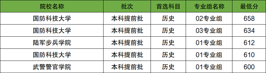 其中分数最低的院校为武警警官学院(01专业组),最低分为600分。最高分院校为国防科技大学(02专业组),2025年最高分为658分。