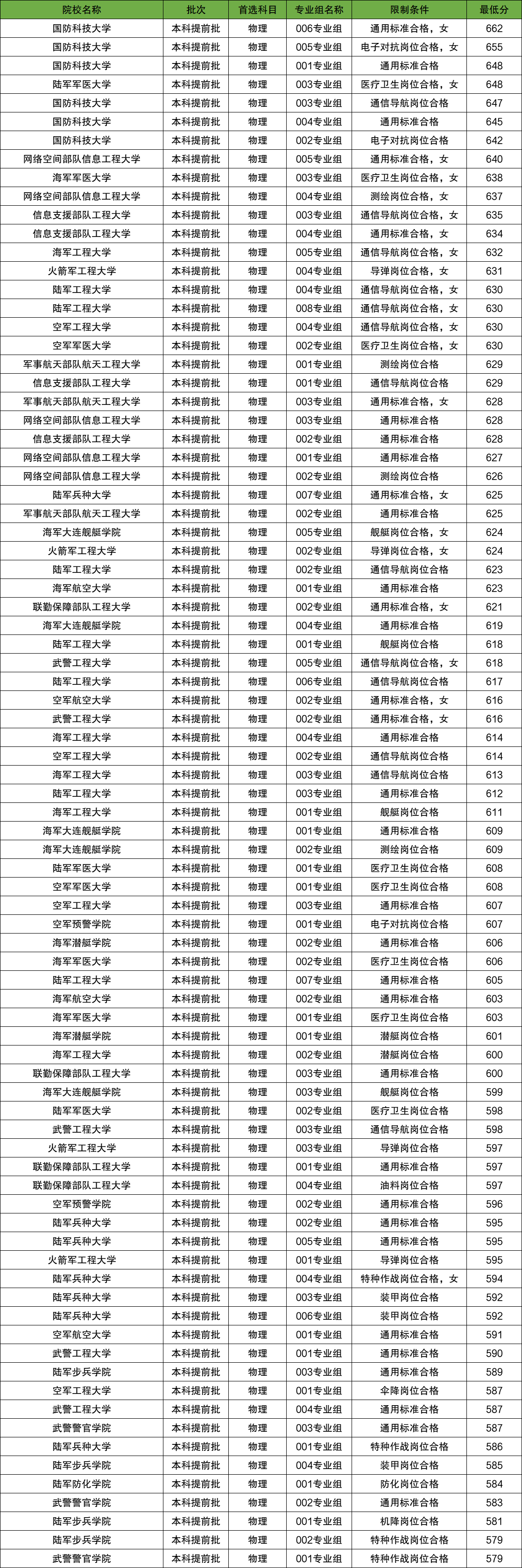 其中最低分院校有武警警官学院(001专业组)、陆军步兵学院(002专业组),2025年最低分为579分。最高分院校为国防科技大学(006专业组),2025年最高分为662分。
