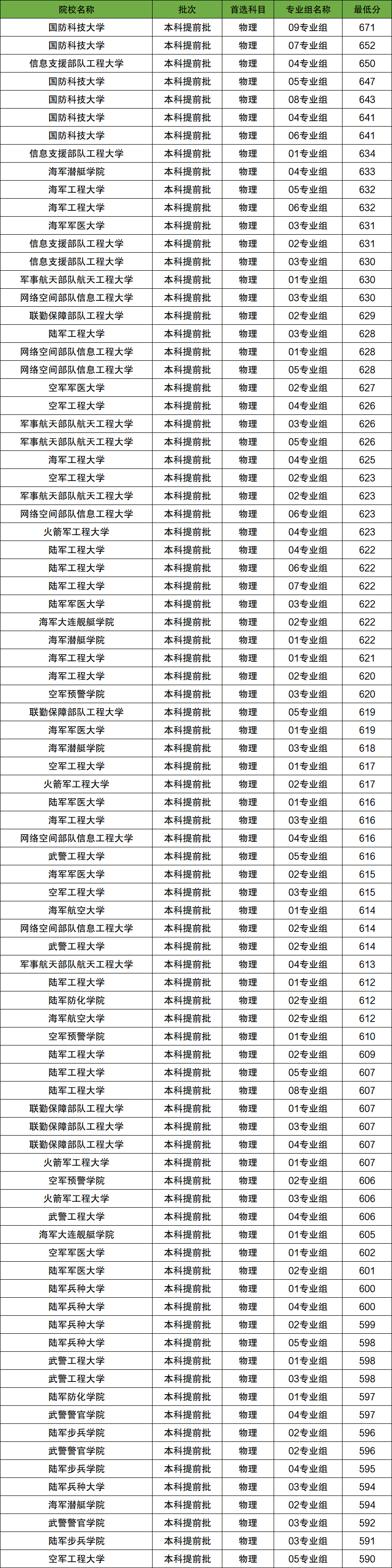 其中分数最低的院校为空军工程大学(05专业组),最低分为590分。最高分院校为国防科技大学(09专业组),2025年最高分为671分。