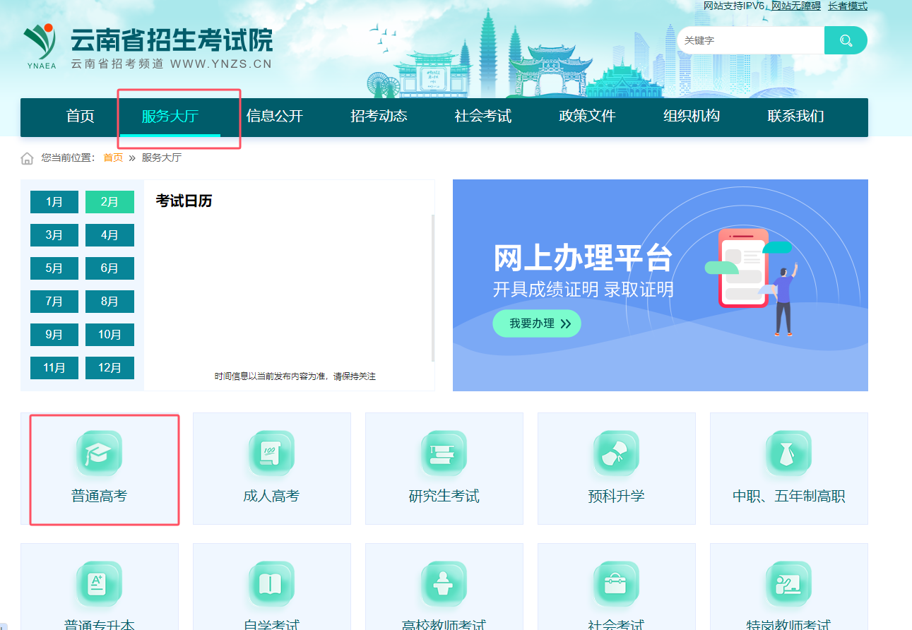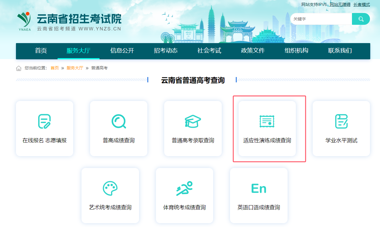 云南省教育考试院首页——服务大厅——普通高考——适应性演练成绩查询