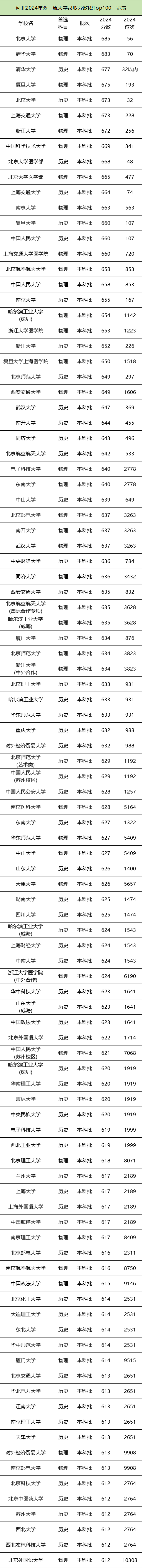 篇幅有限,下面是河北2024年双一流大学录取分数线Top100一览表:
