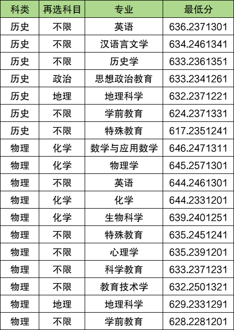 华中师范大学国家公费师范生录取分数线最高的专业:历史组是英语专业,2025年最低分636分;物理组是数学与应用数学,2025年最低分是646分。