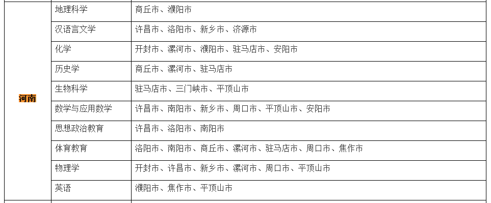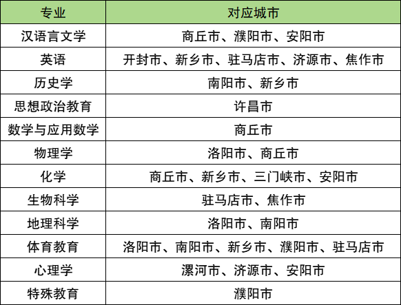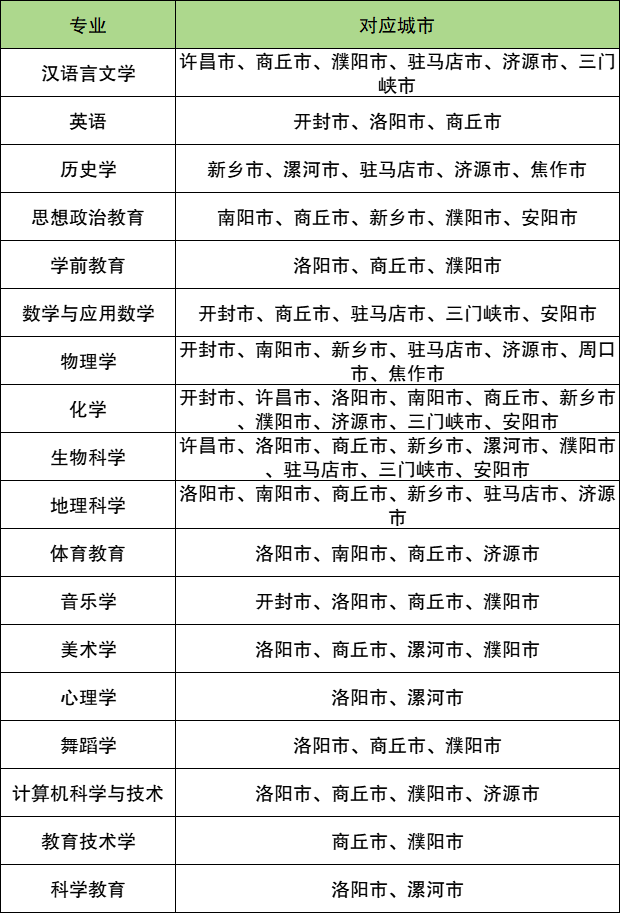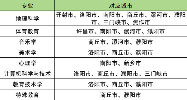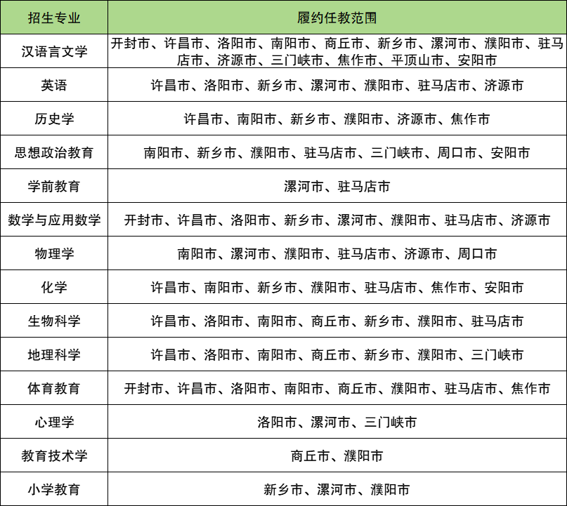 学校国家公费师范生在河南分配去向最多的专业为地理科学,任教范围一共有11个市,包括开封市、许昌市、洛阳市、南阳市、商丘市、新乡市、漯河市、濮阳市、济源市、 焦作市、安阳市。