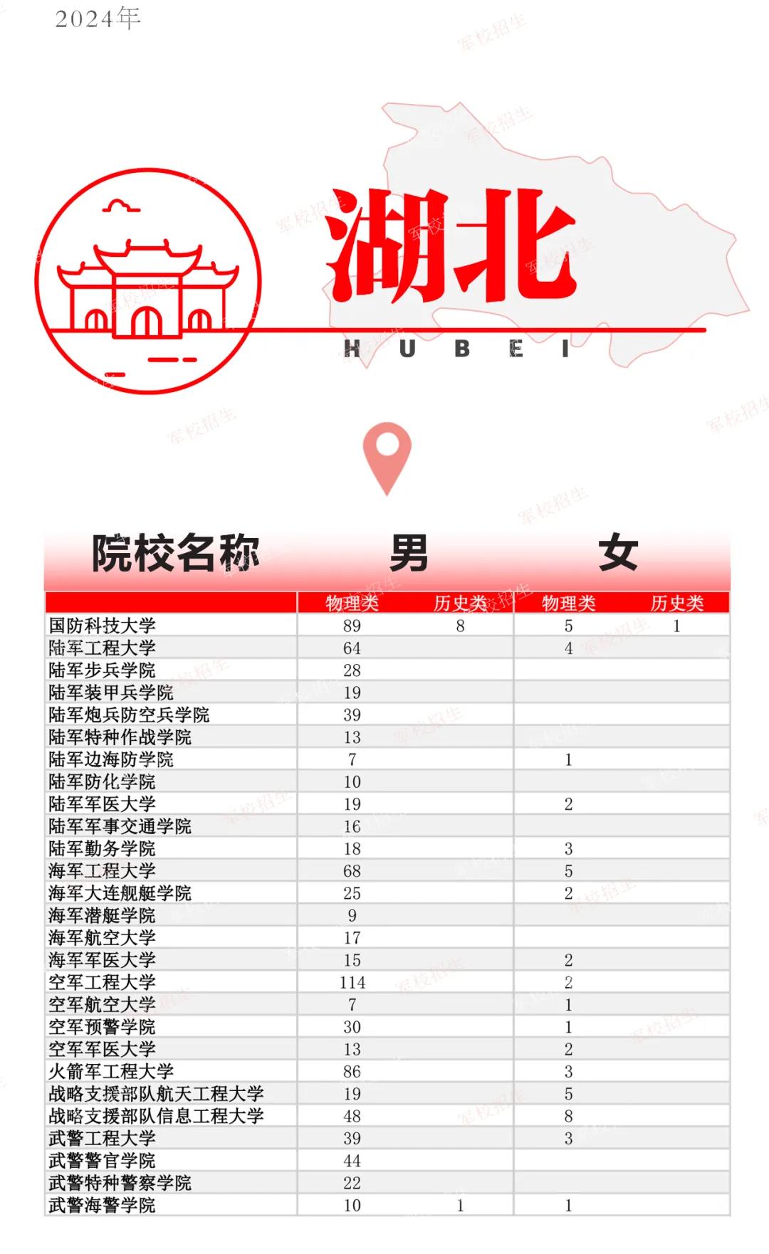 2024年在湖北省招生的军校中国防科技大学共招生103人、陆军工程大学共招生68人、陆军步兵学院共招生28人。本期将介绍2024年全国各军校在湖北的招生人数,包括男生、女生各招多少人。