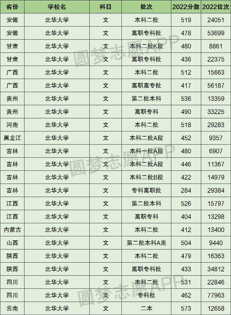 1、北华大学在全国普通高考省份的【文科】招录数据,包含招生批次等信息: