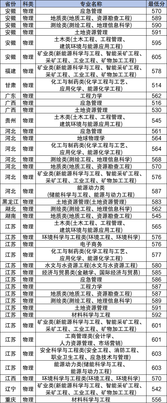 理科:地球物理学563分、土木类(土木工程、工程管理、建筑环境与能源应用工程)565分、化工与制药类(化学工程与工艺、应用化学、能源化学工程)571分、测绘类(测绘工程、地理信息科学)579分、矿业类(新能源科学与工程、智能采矿工程、采矿工程、工业工程、矿物加工工程)582分