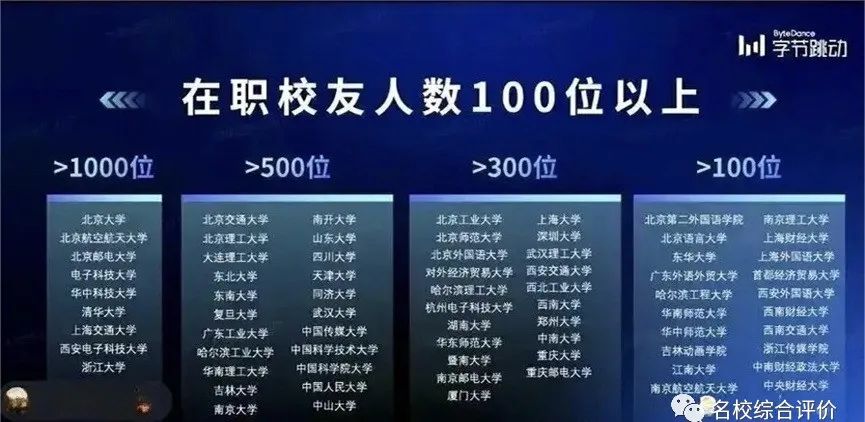 不过以上提到的院校仅属于字节会招聘的部分院校,为了让同学们更全面地了解字节招聘的院校偏好,小编在此整理了字节在职校友人数超过100位以上的院校名单,详情如下: