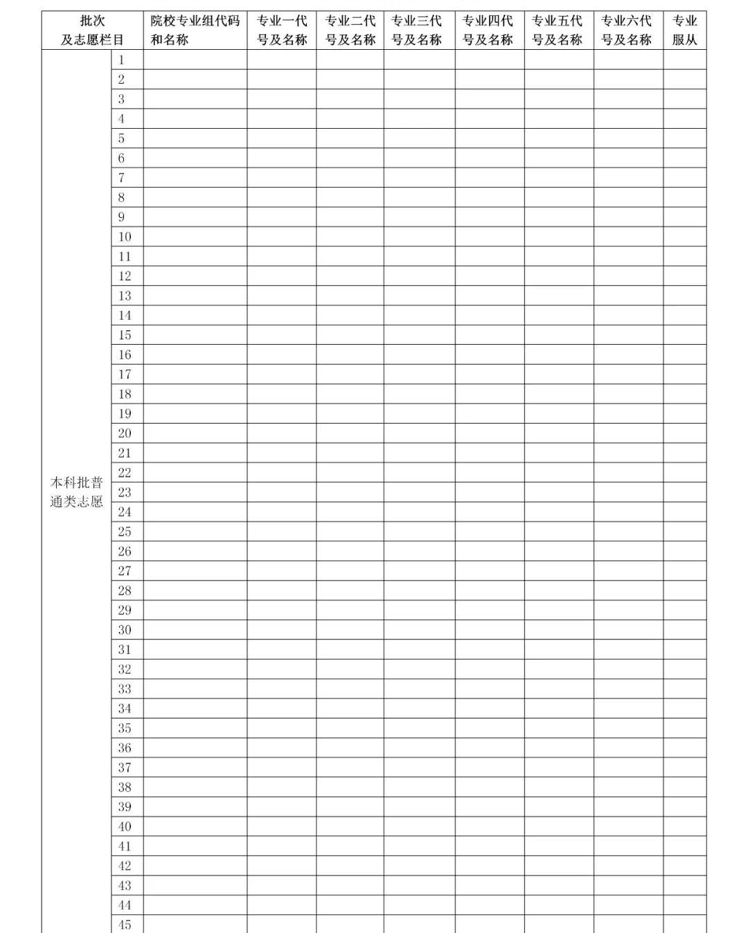 “普通志愿”栏安排普通类非定向计划、普通类定向计划、国家专项计划、地方专项计划、楚怡工匠计划、不组织专业考试的艺术类专业计划、民族班计划、定向西藏就业计划、预科班计划等,考生可根据本人情况兼报符合条件的上述计划类别。设置45个院校专业组志愿,每个专业组内设6个专业和1个“专业服从”志愿。