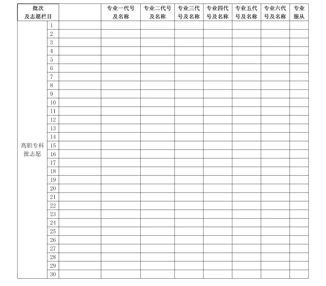 高职专科批中,所有院校专业均采用平行志愿。设置30个院校专业组志愿,每个专业组内设6个专业和1个“专业服从”志愿。